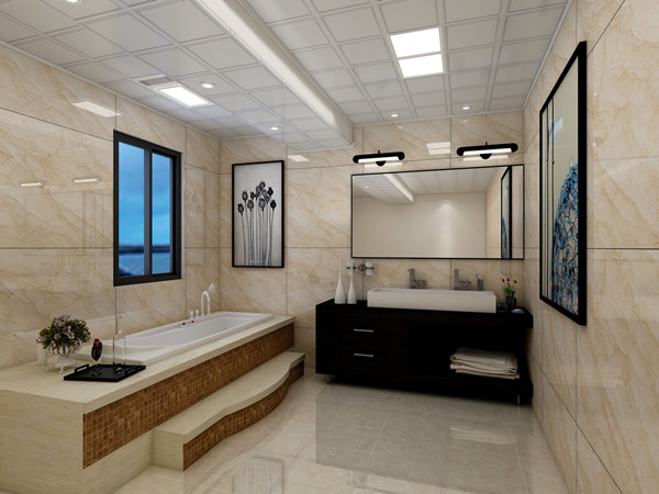 衛浴吊頂: 布局以“簡約、舒適、生活化”為宗旨,有心的是在臺階部分同樣與吊頂的錯層形成了一個呼應,上方的燈還可以滿足我們臺階部分的照明需求,豐富了空間故事感。